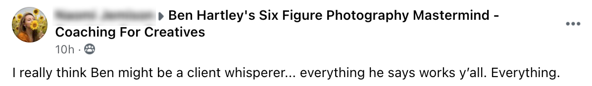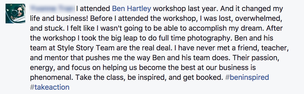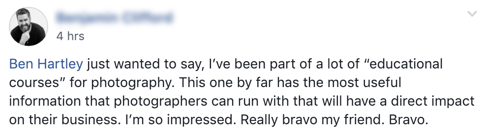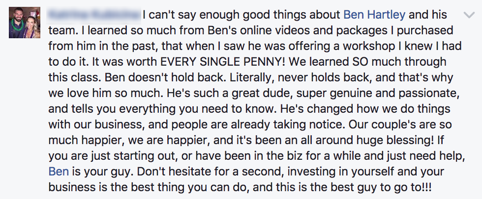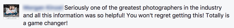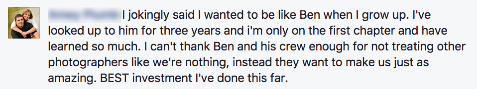 My reputation and student results are my competitive advantage. I have been in the photography industry for over 15 years helping photographers get real results and I'm not going anywhere. You can't do that unless you are the real deal. There is nothing quick about building a profitable sustainable business. I'll show you step by step exactly how to do it but then you gotta put in the work.